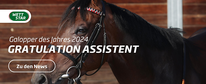 Die älteste Publikumswahl im deutschen Sport war bis zum Schluss hochspannend, doch nun steht der Sieger fest: Mit einer knappen Mehrheit (41 Prozent der Stimmen) wurde Assistent zum „Galopper des Jahres 2024“ gewählt. WETTSTAR begleitete in diesem Jahr als Medienpartner von Deutscher Galopp die Abstimmung und sponserte wertvolle Preise, darunter als Hauptgewinn ein Wochenende in Paris zum Prix de l’Arc de Triomphe.